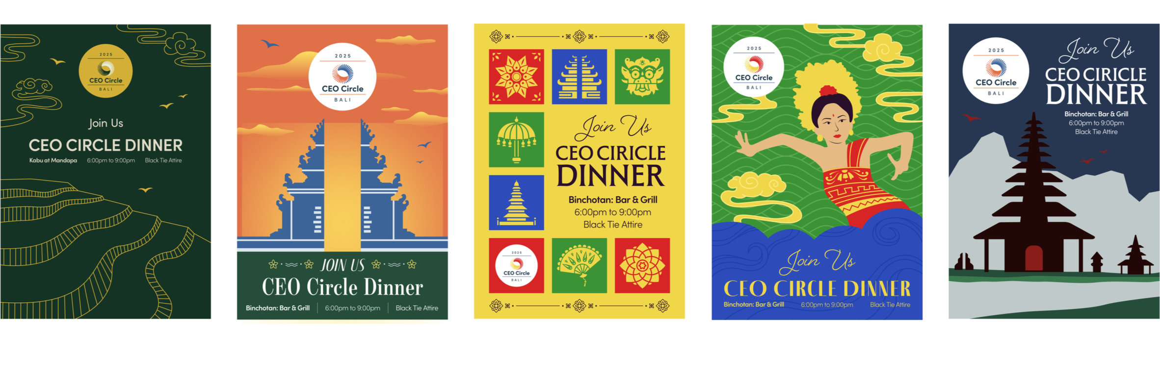 I’d like to highlight some of the early design explorations. At this stage, we were defining the style, tone, and imagery that best capture Bali’s rich culture while conveying the elevated elegance of the event. These are a few of the posters I created before we refined the direction and landed on the final design wrapper.
